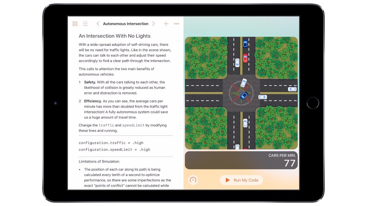 For my scholarship submission for WWDC 2019, I created a Swift Playgrounds Book that simulates what a fully driverless world could look like and the benefits (and drawbacks) that follow focusing on two points: safety and efficiency. I display an intersection with and without lights.
