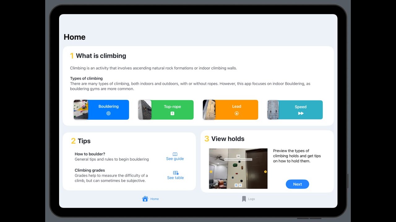The project is an app developed to introduce people to the sport of climbing. The main section shows information about different types of climbing, general tips and provides a table with climbing grade conversions. Additionally, the app is more interactive by providing an AR View that shows different kinds of holds and tips on how to grab them. Finally, there is a logbook to add sessions and display results on charts to monitor progress over time.