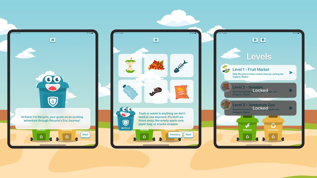 "Recyclo’s Eco Adventure" is an educational app designed to help kids learn about waste sorting. The game follows Recyclo, a friendly mascot, on an adventure to solve waste management challenges. Throughout the journey, Recyclo guides children in understanding and practicing proper waste sorting. I created this game based on observations in my area (Yogyakarta), which has faced ongoing waste management issues in recent years. The problem arises from mixed waste accumulation, making processing di